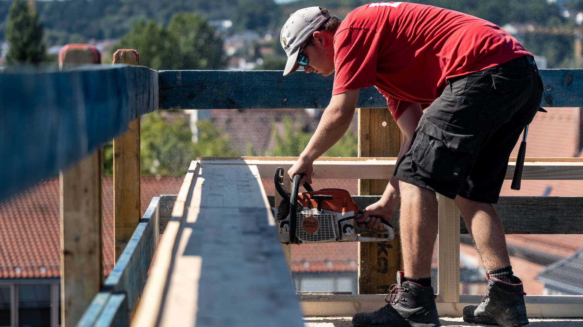 Als Zimmerer arbeitest du mit einem der ältesten und nachhaltigsten Werkstoffe überhaupt: Holz! Du errichtest Dachstühle, baust Häuser, Brücken oder ganze Hallen – präzise, kreativ und immer mit handwerklichem Geschick. Ob auf der Baustelle oder in der Werkstatt – du bringst Pläne zum Leben und siehst am Ende des Tages, was du geschaffen hast.